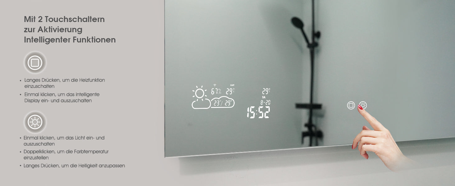 Wisemirror App (kostenlos) verwenden, Heizung und Beleuchtung nur per Touch-Schalter, nicht über die App.