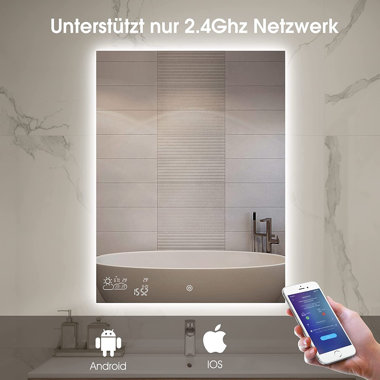 📶Verbinden Sie den Spiegel mit Ihrem 2,4 GHz WLAN und erhalten Sie die Wettervorhersage in Echtzeit direkt im Bad