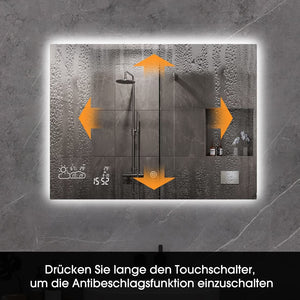 Beleuchtung (zwei Farbtemperaturen, Touch-Dimmfunktion), Antibeschlag, WLAN für Wetter- und Zeitanzeige.