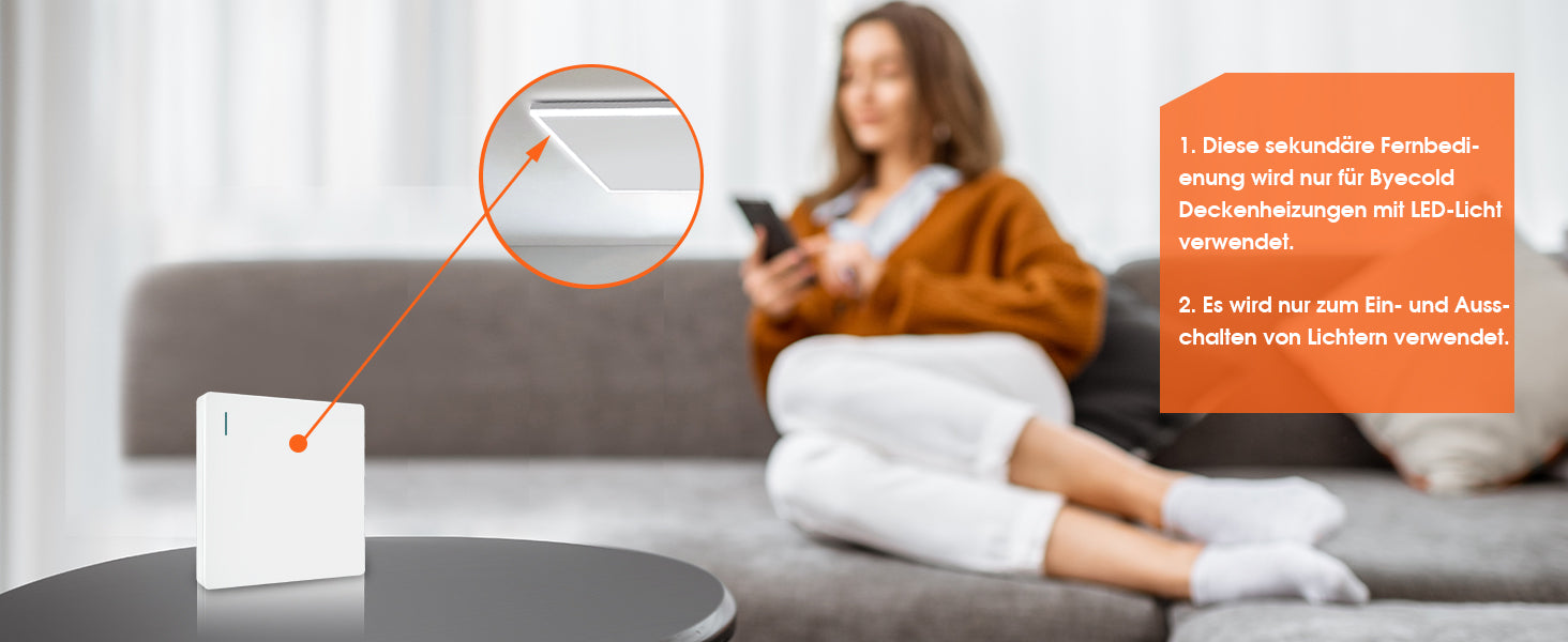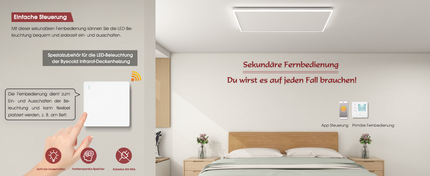 Ein Klick = Licht an. Noch ein Klick = Licht aus. Die beleuchtung lässt sich ganz einfach per Fingertipp steuern. Ein kleines Zubehör, das Ihren Byecold LED Deckenheizung noch praktischer macht.